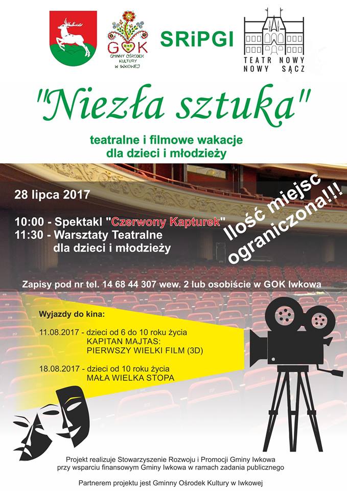 Już w najbliższy piątek aktorzy Teatru Nowego z Nowego Sącza wystąpią na naszej scenie ze spektaklem pt:"Czerwony Kapturek". Tuż po spektaklu zapraszamy dzieci i młodzież na profesjonalne warsztaty aktorskie. Udział w spektaklu i warsztatach jest bezpłatny! Całe działanie p.n. "Niezła sztuka" - teatralne i filmowe wakacje dla dzieci i młodzieży - realizowane jest w partnerstwie ze Stowarzyszeniem Rozwoju i Promocji Gminy Iwkowa przy wsparciu finansowym Gminy Iwkowa.