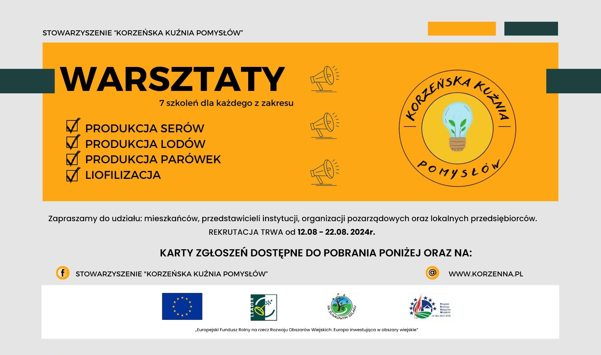 Stowarzyszenie KORZEŃSKA KUŹNIA POMYSŁÓW zaprasza do udziału w szkoleniach, warsztatach oraz dobrych praktykach mających na celu podniesienie wiedzy, kompetencji społeczeństwa lokalnego poprzez zapoznanie się z procesem przetwórstwa: serów, lodów, parówek oraz procesem liofilizacji w ramach operacji pn. „Wzmocnienie kapitału społecznego obszaru Na Śliwkowym Szlaku poprzez organizację warsztatów, szkoleń, działania informacyjne, promocyjne, podnoszenie wiedzy, kompetencji społeczeństwa lokalnego”.